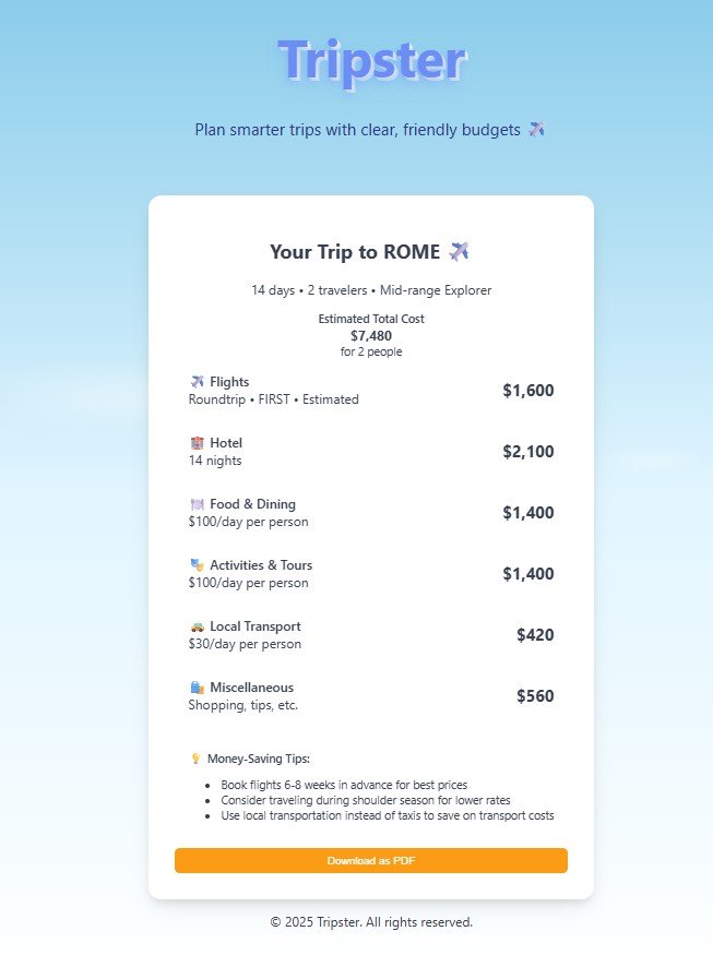 Real flight prices, hotel rates, and activity costs—instantly combined into one clear, accurate travel budget.